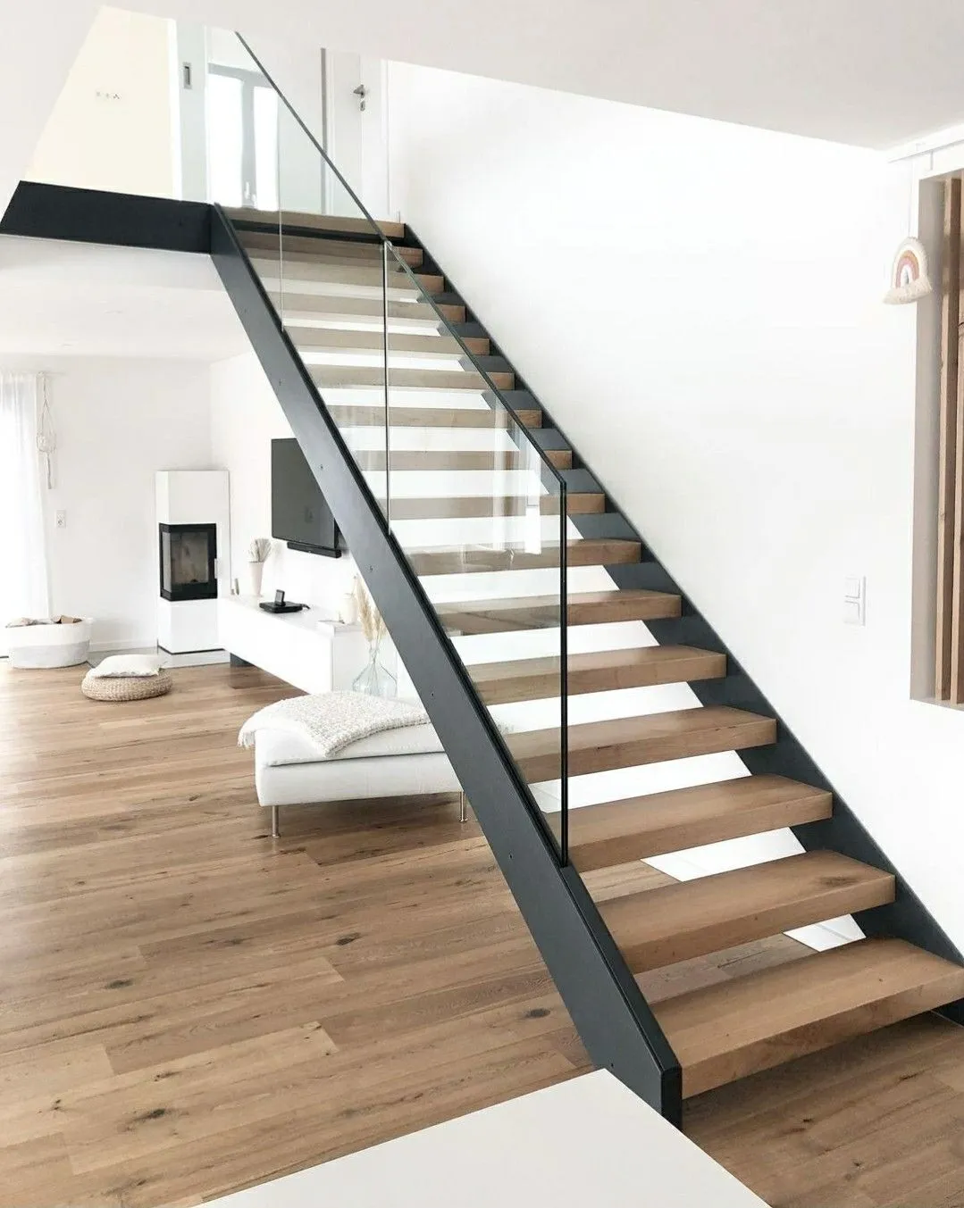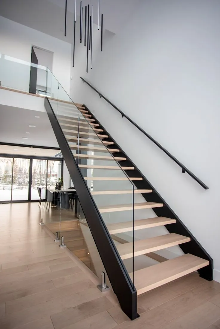 Interior Side Plate Double Stringer Wood Step Glass Straight Stairs L Shape Staircase